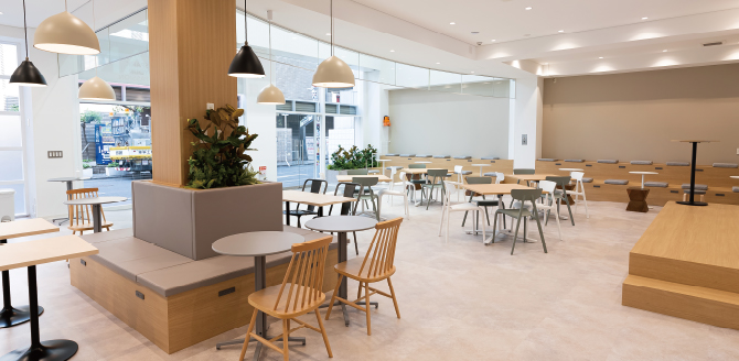 バンタンの相談スペースは完全オープン。いつでも担任に声をかけられる環境です。個別での相談もしやすい、カウンセリングルームも設けています。