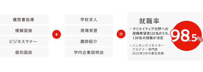 バンタンの希望就職・就業率はクリエイティブ分野※への「1.就職・就業決定数」÷「2.就職・就業希望者」で算出しております